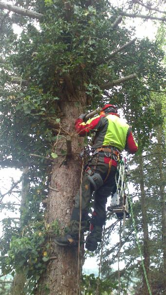 Fällung einer Kiefer in einem engen Garten mittels Seilklettertechnik. Diese Technik kommt zum Einsatz in Bereichen, die für einen Kran oder Hubsteiger unzugänglich sind.